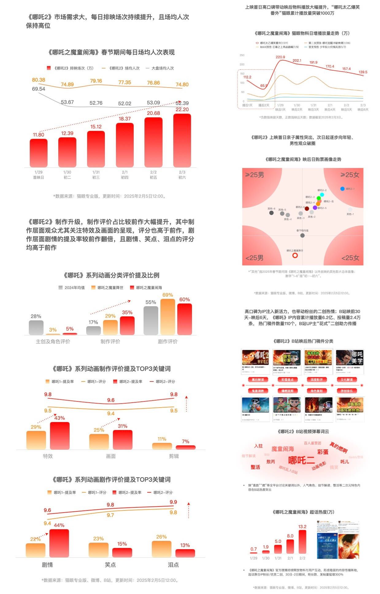 精良的内容制作,是《哪吒之魔童闹海》在今年春节档突围的关键。《洞察》显示,“制作”是映后评论中高频提及词汇,占比较前作大幅提升,此外“剧作”提及率也有成倍增长,证明观众对故事的认可与喜爱。影片上映后,影片宣传物料及二创作品走红,助力影片进一步破圈,为档期票房冠军奠定了观众基础。