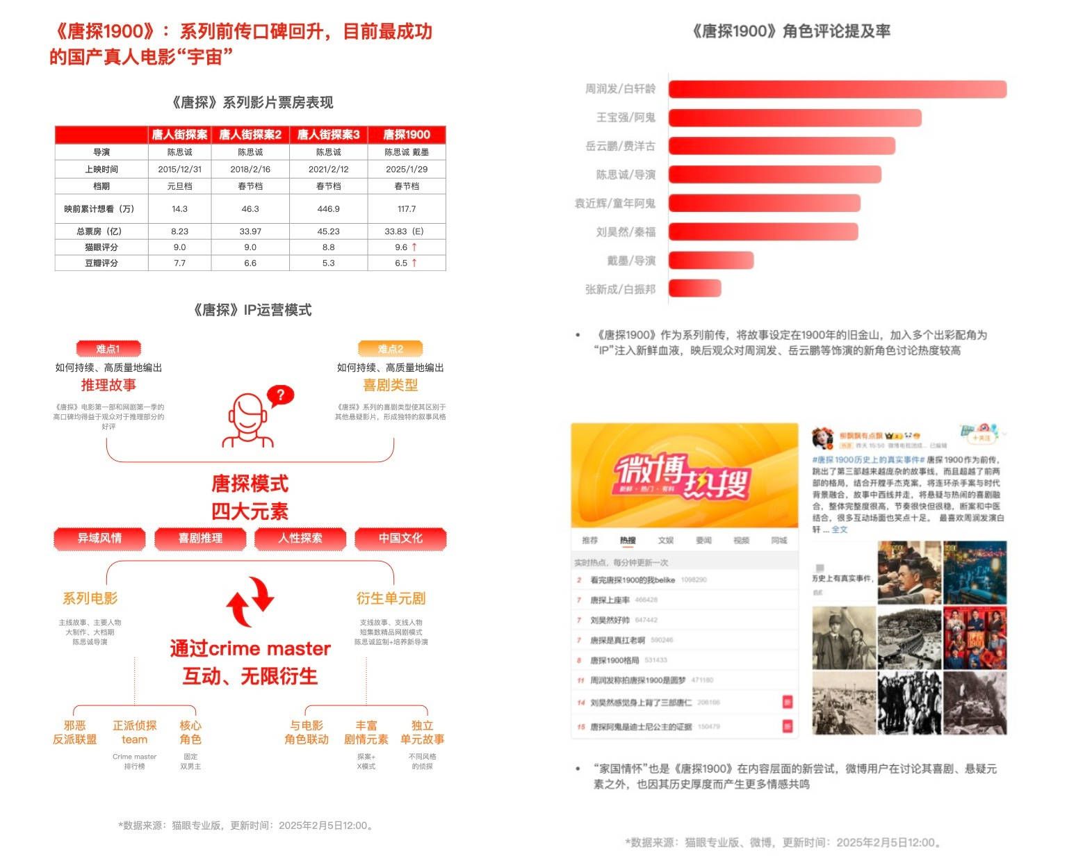 相比前作,《唐探1900》映后口碑有所回升,片中多位角色生动立体,成为观众评论中的高频关键词。影片植入的家国情怀,也是“唐探”系列在内容上的新尝试,相关话题登上微博热搜,引发观众情感共鸣。而在银幕之外,“唐探”系列还有衍生单元剧与电影遥相呼应,可以说是目前最成功的国产真人电影宇宙。