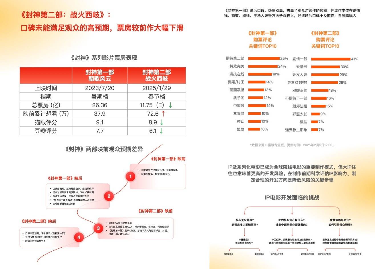 “封神”IP以传统神话为灵感孕育而出,前作《封神第一部:朝歌风云》以较高的热度取得了票房口碑的双丰收,然而续作《封神第二部:战火西岐》未能满足观众的高预期,导致票房和评分表现均不如前作。从“封神”案例可以看出,IP并非提升档期票房的万金油,本体质量过硬的前提下,才能充分发挥IP模式的商业价值。