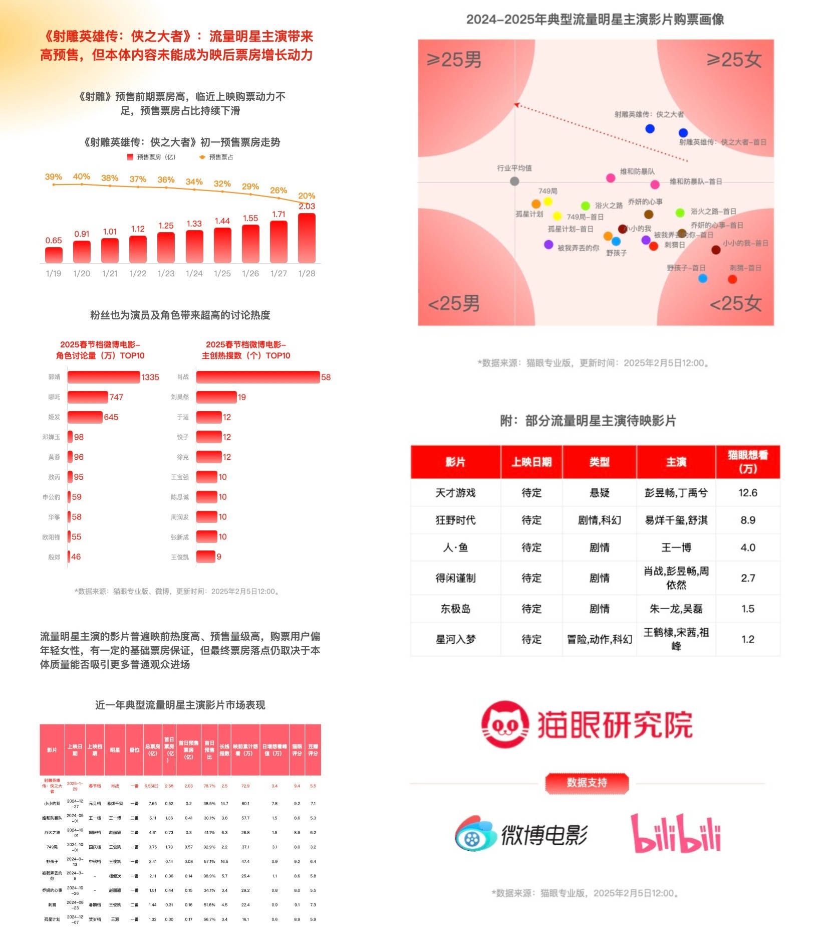 《射雕英雄传:侠之大者》为金庸小说改编电影,并选用流量明星作为主演,以期提升票房号召力。事实上,明星演员确实带动了预售热潮,但影片本身未能为票房带来持续动力,最终表现平平。接下来,还将有多部流量明星主演的影片上映,最终表现如何,让我们拭目以待。